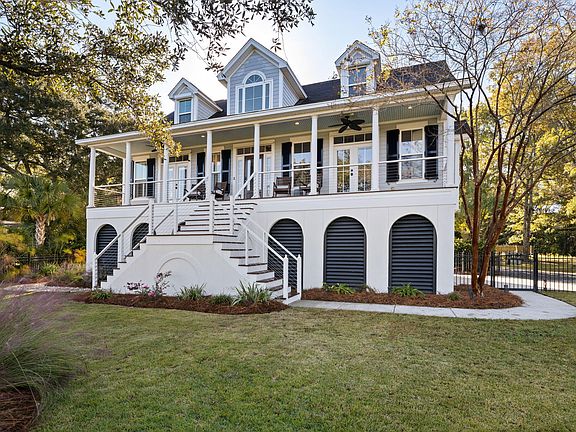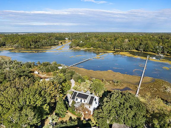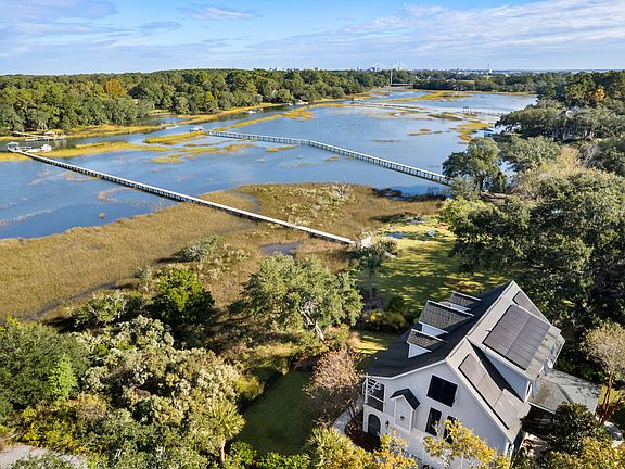 Offered with adjacent .61 acre lot, MLS 22027913. Imagine taking in both the sunrise AND sunset over Ellis Creek from your gracious front porch and from almost every room of this well appointed waterfront home! Designed to showcase the stunning Lowcountry view, this elevated and private oasis is tucked back off of the road and situated down a short private gravel driveway. The fully fenced yard lined with mature landscaping overlooks acres of adjacent pristine marshland and wetlands! Upgrades are numerous and include both smart and green features like 7.8 KW solar panels (paid off), EV charger in the 3+ car garage, Neurio smart home energy monitor and Nest thermostats, plantation shutters and in-ceiling surround sound in the family room. Thoughtful upgrades continueoutside including hurricane shutters for all windows and doors, no-see-um screening on the screened porch, 4 zone Rachio smart irrigation system, 2 french drains and professionally designed landscape with native plants designed to both retain water and attract bees and butterflies! Wake up to the sunrise everyday in the downstairs primary suite boasting sweeping marsh views, access to the large porch and a recently renovated bathroom and closet with stylish herringbone tile, upgraded light fixtures, custom closet organizers, 9 foot long vanity with dual sinks and marble top, oversized clawfoot tub and tiled shower with frameless glass enclosure. The kitchen overlooks the lush backyard and screened porch and features a cute pass through window with a live edge cypress bar installed for easy entertaining on your screened porch! With an island flanked by counter space on both sides and ample cabinet space, the kitchen has plenty of room for storage and prep and is adjacent to the large laundry room and staircase to access to the 3+ car garage. Upstairs are three additional bedrooms with ample closet space and convenient reach-in attic space. One ensuite and one hall bath with tiled floors and marble vanity tops finish off the spacious second floor. The sellers have spared no expense in caring for and upgrading this beautiful waterfront home just one stoplight from Historic Downtown Charleston and 10 minutes to Folly Beach! You truly must see in person to appreciate the quality upgrades, the view and the vibe that living on the water in the Lowcountry is all about!