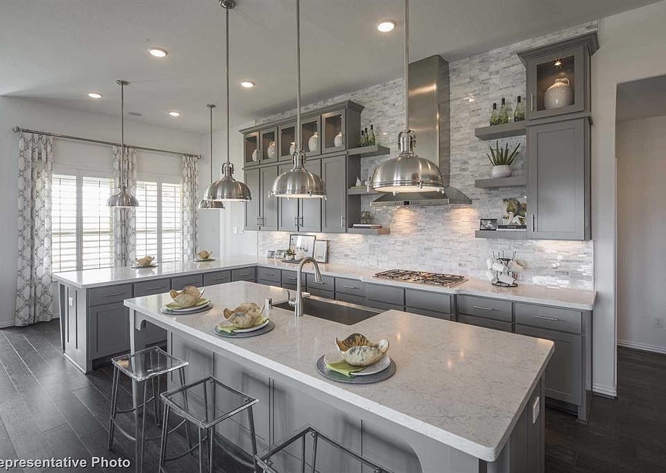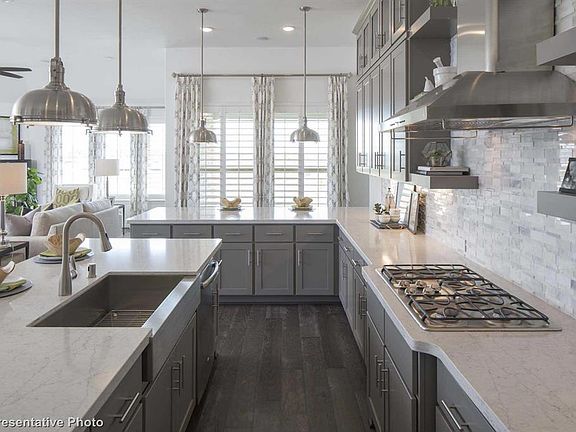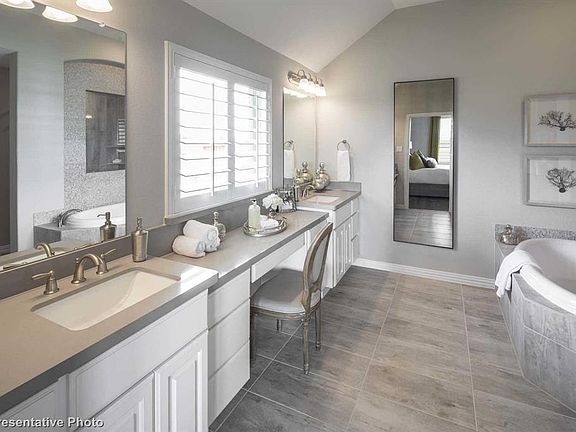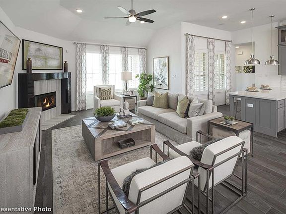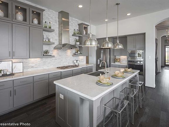 MLS# 14390167 - Built by Highland Homes - Ready Now! ~ Exceptionally designed model floor plan sitting on a corner, tree lined lot, this is a rare quick move in ready opportunity! Custom features include the enhanced kitchen with a floating stainless steel vent hood, L shaped perimeter cabinets and counter tops, luxury porcelain plank tile and a free standing tub in owner's bathroom. Gorgeous white brick exterior and a 3 car tandem garage!