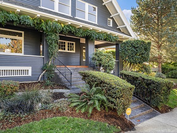 OPEN HOUSE SATURDAY 11-1 & SUNDAY 2-4! Located in historic Ladd’s Addition, this distinguished 1908 residence embodies the timeless character of a Craftsman-influenced Portland Foursquare. Its front-gable roofline, wide overhanging eaves, and broad covered porch reflect early-Portland craftsmanship, complemented by original millwork and multi-pane windows highlighting its graceful façade. Set on a distinctive unique lot with rare, wide frontage for the neighborhood, the property offers a sense of privacy, lush mature landscaping, and the beauty of a designated Portland Heritage Tree #287. A spacious, detached three-car garage offers room for vehicles, storage, and versatile use. Inside, beautifully maintained period features include rich woodwork, leaded glass, original hardwood floors, beamed ceilings, and classic built-ins. Bright, spacious rooms flow effortlessly from the welcoming entry through the living and dining areas, with large picture windows framing tree-lined street views. The upper level features four comfortably sized bedrooms, a full bath, and a sunroom ideal for reading, office use, or creative pursuits. The expansive finished lower level adds even more versatility with generous bonus/living space, a full bathroom, and direct exterior access. With its quiet, friendly, village-like atmosphere and proximity to neighborhood markets, local eateries and more, Ladd’s Addition offers an unmatched blend of history, charm, and convenience. A truly inviting place to live. [Home Energy Score = 1. HES Report at https://rpt.greenbuildingregistry.com/hes/OR10241927]