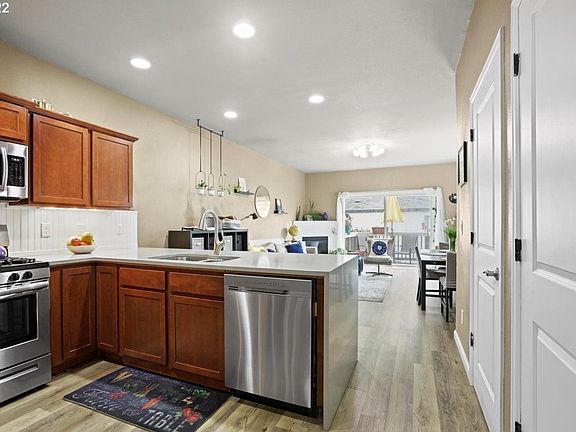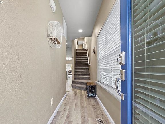 Cozy & updated, end-unit Townhouse with no HOA dues & added A/C. Embrace the natural lighting and high ceilings on the main level with Luxury Vinyl Plank flooring. New waterfall edge quartz counters in kitchen w/ eat-in bar, gas stove & SS appliances. Updated light fixtures, freshly painted trim & doors, brand new back sliding door. New summer projects on the deck and side yard await you. Expansive primary bedroom w/ WIC. Laundry on the main floor, overhead garage storage included. [Home Energy Score = 9. HES Report at https://rpt.greenbuildingregistry.com/hes/OR10155150]