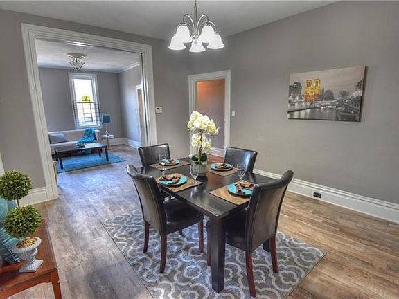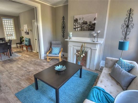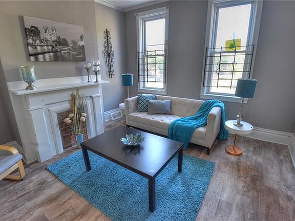 Move-in ready home! New furnace and central AC! Remodeled kitchen w/ cement countertops, white cabinets, stainless steel appliances. New roof! Fresh paint. New flooring. Huge bathroom with vanity, storage, upstairs laundry hook-ups! Tall ceilings! Brick row house with a back yard perfect for entertaining! Tons of storage. Spacious rooms throughout. Modern finishes. Walk to downtown, restaurants, shops and more! (Note no central AC on upper floor - common with older homes; baseboard heat on this floor)