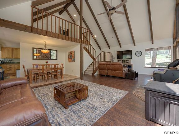 Looking for a retreat or full time living away from the hectic city life? Check out this newly listed property. Fantastic value for this beautiful Mountain style home in a park setting on level and usable & fenced 6.06 acres. Fruit trees, rose bushes and nice garden areas. The perfect location not too remote just 10 minutes from Mt Ranch and the hardware & grocery store at Sender's market in Mountain Ranch. Updated custom home w/quartz counters & stainless appliances. Gorgeous vaulted wood ceilings, 3 bedrooms & 3 full baths, loft area, open great room concept. Spacious master suite w/ walk in closet & loft perfect for home office or exercise or hobby room. Nice wood grain flooring. Workshop area & recreation room. Peaceful setting and nice spacious deck to enjoy the peaceful setting. Excellent well w/ water softener. Plenty of level parking area for Boat or RV. usable for horses