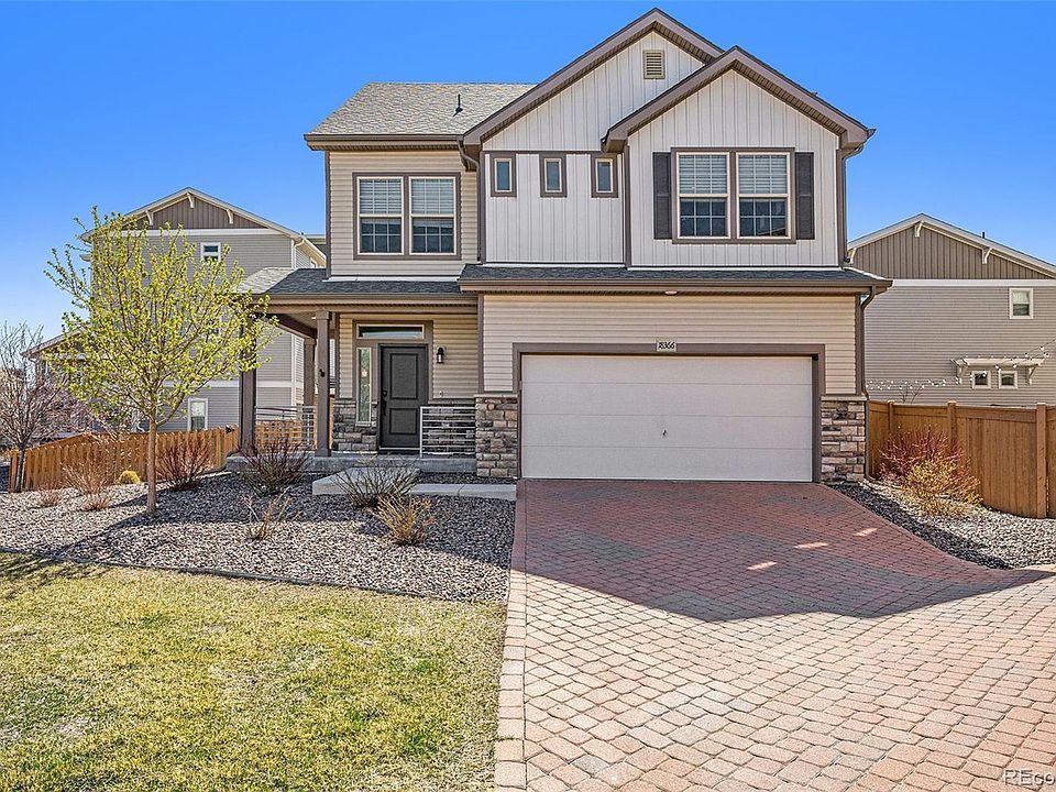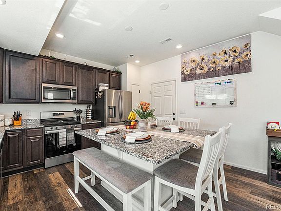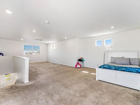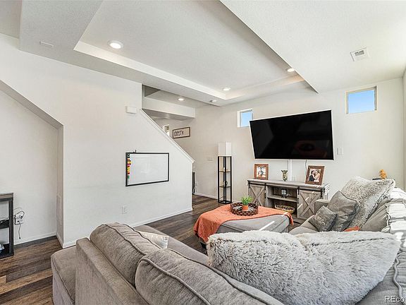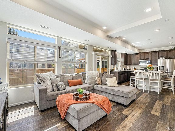 Presenting a remarkable three-story residence situated in the desirable Reunion community. This meticulously designed home offers a sophisticated and comfortable living experience. Upon entering, you are welcomed by an open-concept main level characterized by luxury vinyl plank flooring and a generously sized living room bathed in natural light. The well-appointed kitchen features stainless steel appliances, elegant cabinetry, and a substantial island, providing an ideal space for both everyday living and entertaining. The second floor hosts the primary bedroom suite, a private sanctuary complete with a contemporary en-suite bathroom featuring modern fixtures, an oversized shower, dual vanities, and a substantial walk-in closet. Two additional well-proportioned bedrooms and a full bathroom are also located on this level, along with a dedicated laundry room. Ascending to the third floor reveals a versatile and luminous flex space, which provides access to the magnificent private rooftop deck. This exceptional outdoor amenity offers an ideal setting for social gatherings, stargazing, or simply enjoying the picturesque views, including Longs Peak. Notably, this property is one of only four within the Carriage House community benefiting from a professionally maintained front yard, courtesy of the HOA. Furthermore, it occupies one of the largest lots, featuring a fully fenced, low-maintenance backyard equipped with drip irrigation. Enhancements include a Reverse Osmosis Filtration System and a Water Softener. Residents of Reunion enjoy access to a variety of community amenities, including parks, walking paths, and the Reunion Recreation Center and Pool. The property's convenient location provides easy access to retail centers, entertainment venues, Denver International Airport, and major thoroughfares, ensuring a seamless and enjoyable lifestyle.