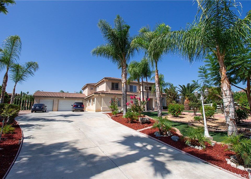 Quiet cul-de-sac perfect for the lifestyle you desire to raise your family and enjoy your life. This is it the home and land that is a right fit for you and your family. This energy efficient home boast 34 solar panels still under warranty with an average energy bill of about $2.00. Home features 5 bedrooms, 4 bathrooms, thankfully this one has 2 bedrooms downstairs, one of them is a master bedroom with an on suite bathroom and walk in closet. Also downstairs you'll enjoy the formal living & dining room , large open kitchen with granite counter tops, house has dual access staircase, cathedral ceilings, with swarovski crystal chandeliers in multiple locations of the home. There are 2 breakfast bars, large eating area. Property has too many upgrades to list ( Over $200,000.00 ) of improvements. The interior has a living area of 3,869 sqft. This horse and RV parking home sits on a 1.1 Acre Lot, 47,916 sqft. The large storage unit stays with the land. Come enjoy the outdoor kitchen with your own Cantina and built in bar stools. The Fire Pit has a sitting area for about 10 people, compete in your own game room. Water conservation landscaping, turf and technology including a sprinkle system for each plant & palm tree. Live, laugh and love in your covered patio.