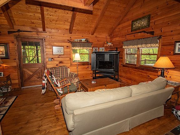 Creekfront Cabin on 4.8 acres with privacy and easy year-round paved access. Open floor plan with living room/dining and kitchen. Large kitchen with granite countertops-open to the dining and living room. The living room is very spacious, with a wood-burning stove. Hardwood floors. Master on the main with walk-in river rock & tile shower. Upstairs is a loft bedroom with a balcony and bonus room. Nice upstairs bathroom with claw foot soaking tub. Large rec/family room in the basement with a gas stove. Separate storage room. Ample outdoor area with a fire pit to enjoy the rushing creek and mountain views. One car carport. The view can be opened up even more if you wish. Would make a great vacation rental. Creek is off the hill in front of the house but can for sure hear it at the house