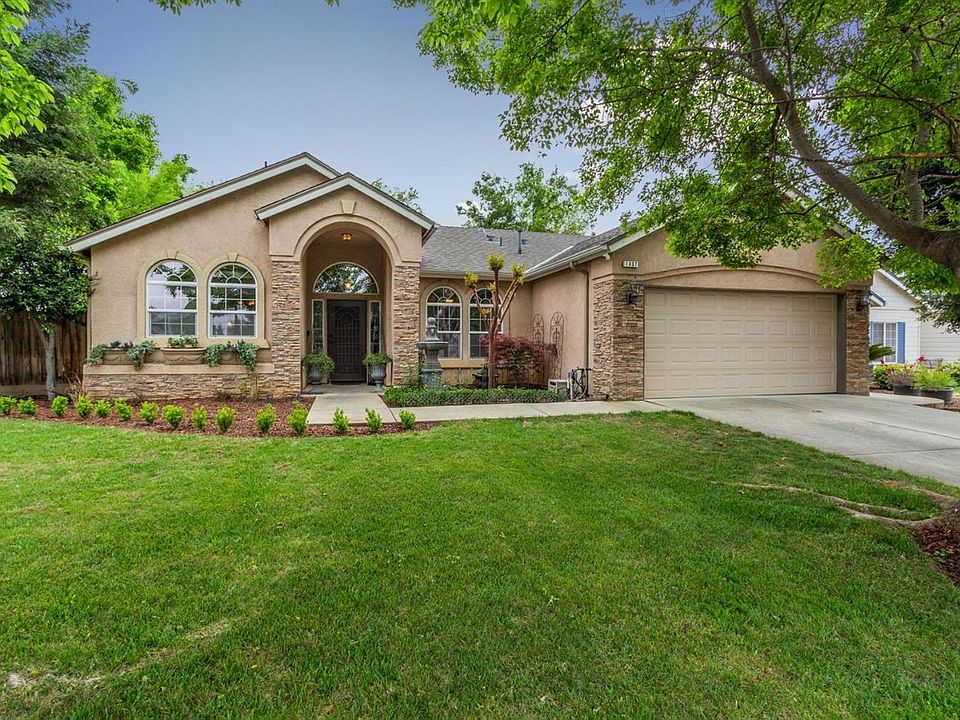 The perfect family home... Lovely 4 bedroom, 2 bath home on a corner lot in a pleasant Sanger Neighborhood. The mature landscape and beautiful entry invite you home. Grand high ceilings in the entry and the great room make this home feel light and spacious. Kitchen and great room are bathed in natural light from the dramatic arched windows. You'll love the cozy fireplace on the remaining chilly Spring nights. Spacious Master Suite with large walk in closet and a wonderful master bath with walk in shower, oval tub, two vanities/sinks and again, lots of natural light. The additional bedrooms are generously sized. Lots of storage throughout the home and a great big closet in the laundry room. Talk about handy! Finally, enjoy the shaded back yard and custom gazebo. The owned Solar helps keep your utility costs to a minimum. Don't miss this!
