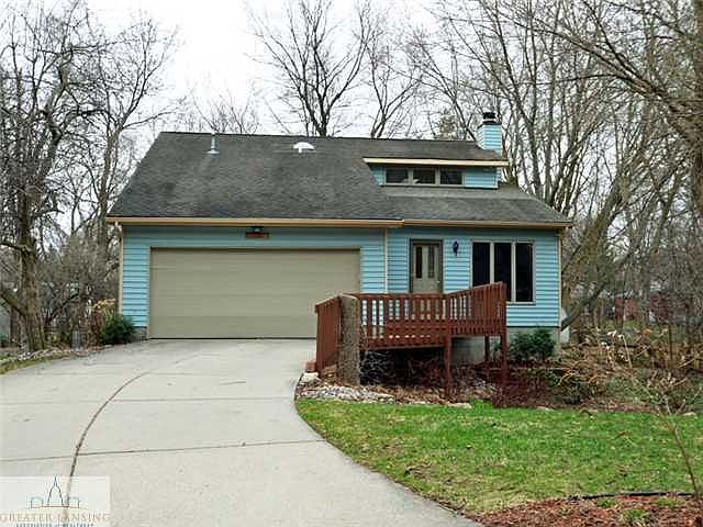 East Lansing contemporary, this home will make you smile! 5 minutes to MSU! On a cul-de-sac with private backyard and across from woods and walking trail - in the heart of East Lansing but at the end of a road and nestled by nature! The vaulted ceiling in Great Room leads to a skylight loft, giving the home an inspiring entrance. This home has lots of natural light, hardwood floors and a cozy fireplace in the living room that will welcome you home. First floor master with walk-in closet. Recently refinished Hardwood floors and oak rails/details. $5,000 of landscaping and in-ground irrigation in 2011, including flowing rock garden, rare Japanese Maple trees, perennials and butterfly bush. Over $10,000 updates in November, 2013, new carpet in Master, replacement windows, and freshly painted rooms and deck. Over 2,200sq. ft. of finished living space on 3 levels, each with a full bath. Deck in front and back yards.