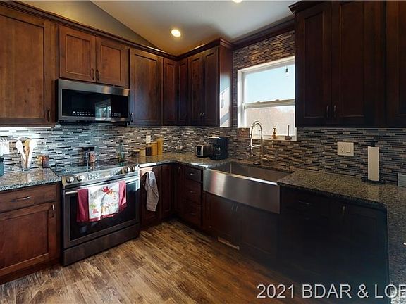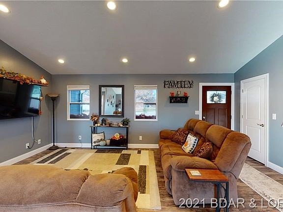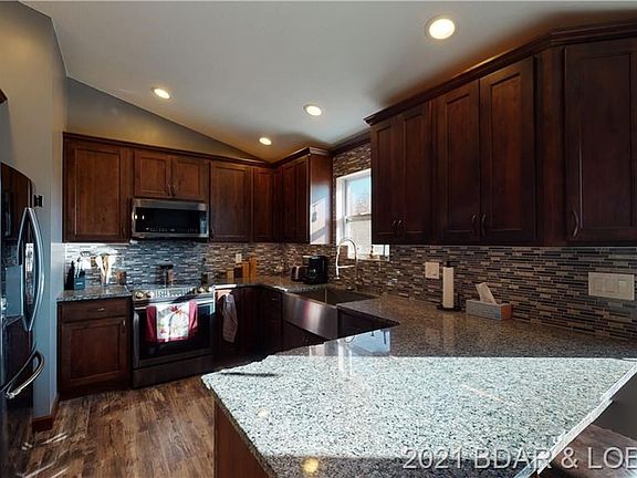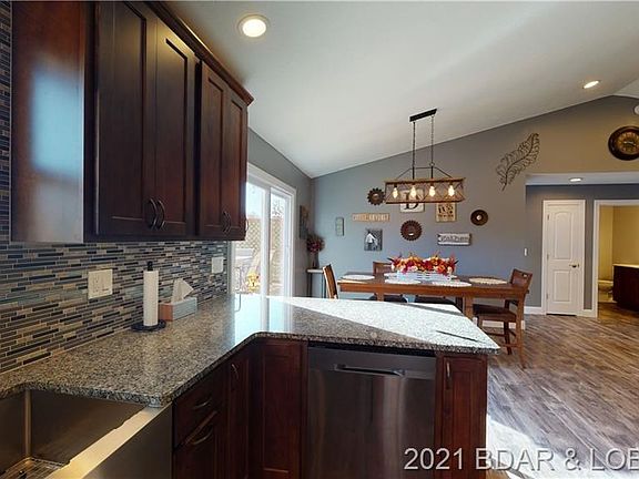 Built in 2019, this home features an abundance of upgrades! Granite counters, custom kitchen cabinets, black stainless appliances. LVP flooring throughout common areas. Guest bathrooms feature solid surface counters, oversized shower/tub combo with tiled shower walls and tiled floors. Special features throughout homes like LED lights in outlets and canned lighting system. Main level laundry. Large master suite features walk in closet & shower with tiled shower walls and floor. Head to the basement for a LARGE living room perfect for game tables, theater or play room. 2 extra bedrooms are provided for overflow guests. They also have their own wet bar. Walk out the basement to your own private 3 acre oasis with an above ground pool and fire pit. Conveniently located within minutes to Camdenton. The front exterior features hardy board & stone accents along with 2 car garage. The back exterior has an EXPANSIVE deck and concrete patio for entertaining plenty of friends and family!