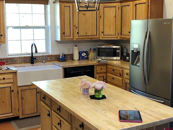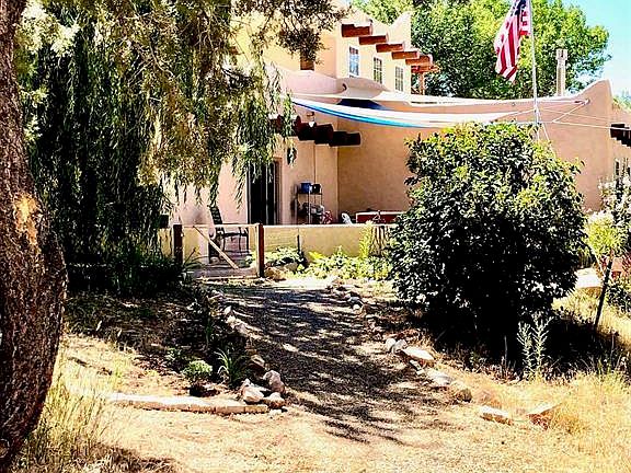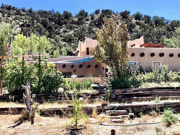 This nine-acre property boasts a beautiful stucco Sante Fe style home located in Montezuma County along McElmo canyon just minutes South and West of Cortez. Uniquely situated on the side of the canyon abutting the Bureau of Indian Affairs land, this property overlooks the valley where hay and cattle have historically been grown. The lot contains nearly nine acres of land that includes elm, willow, and juniper trees and with the Wilson ditch running just a few feet from the house, access to water for growing peach trees, hollyhocks, and iris is more than adequate. Unique in its shape, the lot runs along road G for 2300 feet and has three access points with a graveled driveway. The rocks around the property are large and provide all kinds of natural landscaping and the house compliments this nicely. Situated above the valley floor, you can look to the east and see the sun rise. As you can see, the builder used 12" diameter logs for structure and form. With a simple layout of the floor plan, there is privacy in every room and the kitchen comes with newly remodeled butcher block counter tops, porcelain farmhouse sink with instant hot, and a tidy kitchen island. The vaulted ceiling adds volume to the room and the 60 mil roof adds some outdoor living space as well. To compliment the living space, there is a swim spa on the front of the house with colorful sunshades for comfort. The house is heated and cooled by a mini split using two units currently that can be expanded to four. Two of the slider doors are Anderson and the other french door opens onto the front. The attached wooden awnings on the back of the house provide shade and storage. With nine acres included, there is lots of room for a garage or any structure you might build, (remember that there are three separate entrances). The owners have spent hours painting and remodeling. At this elevation, the winters are mild, the hill protects from the wind and the sun, and you will enjoy living in the southwest. Septic newly pumped and inspected. The house and all it offers is ready for its new occupants.
