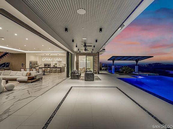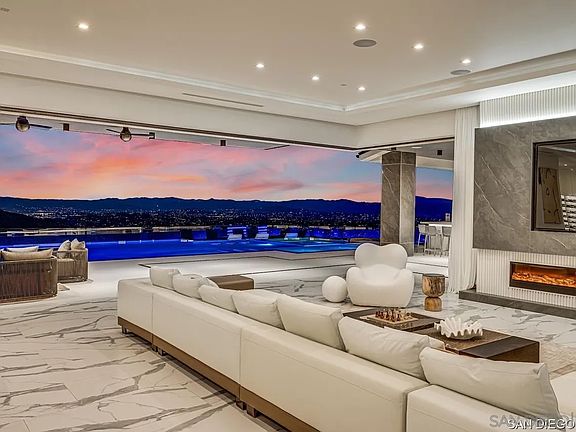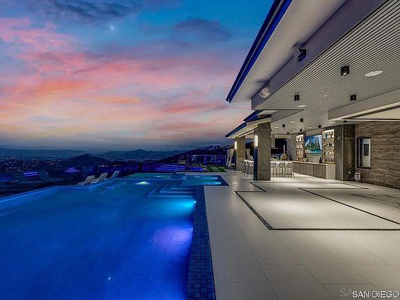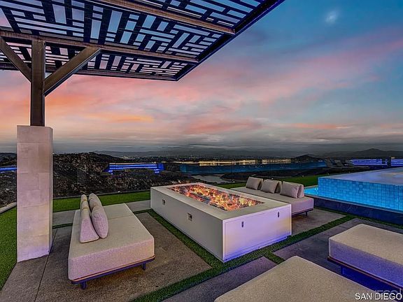 Welcome to your dream home, a 6-bedroom, 6.5-bathroom masterpiece perched at the highest peak of the prestigious Cielo community in Rancho Santa Fe. Nestled in a quiet cul-de-sac, this 8,700 sq. ft. new construction blends modern luxury with breathtaking panoramic views. Step through the grand entrance and into a world of elegance, marked by a stunning double staircase and sunlit open-concept spaces. Floor-to-ceiling glass doors seamlessly connect indoor and outdoor living, while granite and porcelain finishes add a touch of sophistication throughout. The gourmet kitchen is a chef's delight, featuring top-of-the-line appliances, a spacious island with bar seating, and ample space for entertaining. The grand primary suite is a true retreat, complete with a private balcony, cozy fireplace, and breathtaking sunset views. Each additional en suite bedroom is thoughtfully designed with custom closet cabinetry for maximum comfort and privacy. The property also includes a versatile 1-bedroom, 1-bathroom ADU with a private entrance, ideal for guests, a home office, or extra living space. Step outside to the ultimate entertainer's backyard, boasting a grand pool, hot tub, covered bar, built-in grill with pizza oven, and a cozy fire pit, all set against stunning vistas. Additional highlights include an elevator, a spacious 4-car garage, a golf cart garage, a private driveway, and 65 solar panels on a custom-designed metal roof. Located in a gated community with 24-hour guard service, this home offers both security and access to top-tier amenities, including clubhouses, shopping, gyms,