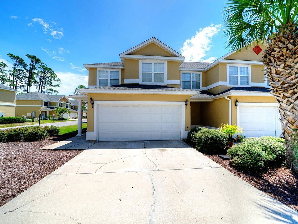 3 bed, 2.5 bath fully furnished end unit townhome with a garage in the gated community of Annabella's Townhomes. This spacious home features an open living room, dining area and kitchen floor plan. The kitchen is equipped with a plethora of cabinets and a pantry for storage, plenty of counter space, a breakfast bar and white appliances. The dining area has double doors leading to the back patio with water views, creating a seamless area for hosting friends and family. There is a coat closet and utility closet downstairs for indoor storage. There is also a half bathroom downstairs for convenience. All three bedrooms are located upstairs for peace and privacy from the main living area. The spacious master bedroom features a balcony overlooking the pond, a grand private en suite, and a large