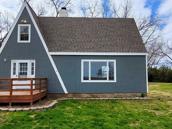 This beautiful A-frame-style house provides a surreal level of outdoor privacy & scenery one 2 acres m/l. Upstairs offers a large primary bedroom/bath, with 2 additional bedrooms in the basement with nonconforming egress windows. NEW in the last year: roof, gutters, rock driveway, basement renovation, & ductless heat pump split system for heating & cooling! Heated flooring in main floor bathroom. Make the 26â x 26â outbuilding into a two-car garage or workshop. Conveniently located between Lawrence &Topeka.