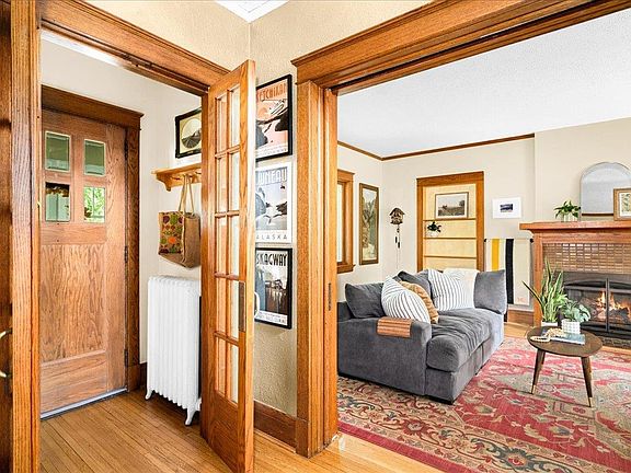 Nestled on an oversized landscaped lot in Hunters Park, this 4-bedroom, 3-bath traditional home will steal your heart from the moment you arrive. Step into the inviting 3-season front porch—perfect for morning coffee or a good book—before entering the warm and welcoming main floor. You’ll love the spacious living and formal dining rooms with their beautiful oak hardwood floors, crown molding, pocket doors, a handsome gas fireplace, and a stunning built-in buffet framed by original leaded glass windows. The kitchen offers abundant off-white cabinetry, ample counter space, and easy access to the back patio and private, fenced backyard. Upstairs you'll find 3 bedrooms with maple floors, great closet space, a full tiled bath, and a walkout to the upper deck. The third floor offers a huge 4th bedroom or flexible bonus room. The finished basement includes a cozy rec area, ¾ bath with tiled walk-in shower, storage, and laundry. Plus: newer boiler, maintenance-free siding, 2-car garage, and a charming chicken coop. Just steps to Tischer Creek trails and Mt. Royal amenities—don't miss it!