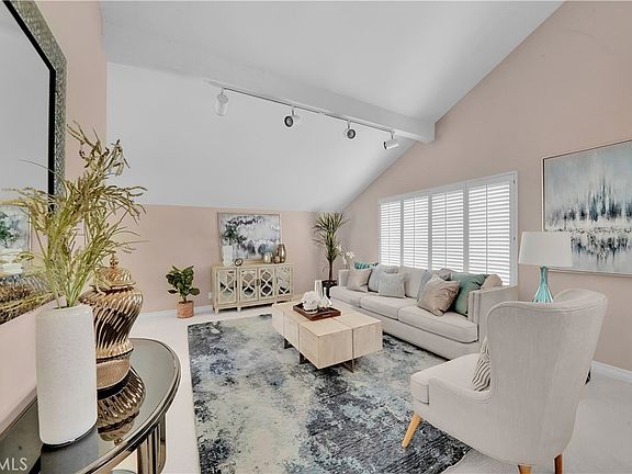 Nestled in the coveted neighborhood of prestigious award-winning homes with a large park, playground and basketball court, this executive-style residence epitomizes luxury living. Boasting a sparkling pool and spa with a downstairs bedroom set against a backdrop of mature landscaping and front brick accents, this home welcomes you with a double door entry adorned with a stunning leaded glass starburst, inviting natural light to cascade into the beautiful tiled foyer. Inside, high vaulted ceilings and plantation shutters enhance the sense of grandeur, while dual-pane windows and sliders offer views of the lush surroundings. Custom track lighting sets the perfect ambiance in the spacious living room. The adjacent dining room seamlessly flows into the well-appointed kitchen, featuring an abundance of pretty white cabinetry and modern appliances including a refrigerator, microwave, dishwasher, gas stove top, and separate newer oven. A breakfast counter and casual dining area provide options for every meal, ensuring both functionality and style. The large family room boasts custom stone-like accents, creating a cozy retreat for gatherings. A full bathroom with a walk-in shower and a downstairs bedroom offer added convenience and flexibility. Upstairs, the expansive master suite awaits, accessed through grand double doors. Vaulted ceilings and a slider door leading to a private deck enhance the sense of luxury, while a huge walk-in closet w/organizers and attached private bathroom offer indulgent comfort. The bathroom features dual sinks, ample storage, recessed lighting, a privacy toilet, and a walk-in shower with tile surround and glass doors. Two additional guest bedrooms have been extended for added space, each boasting large closets, plantation shutters, and recessed lighting. The upstairs guest bathroom, complete with a skylight, features a tub/shower combo with custom tiled surround. Outside, your backyard oasis awaits with a sparkling pool and spa, raised deck for entertaining, tall privacy trees, and custom canopies for the windows, creating a serene and inviting outdoor retreat. Conveniently located near parks, shopping, restaurants, and entertainment, with easy access to the beach and John Wayne Airport, this home offers the perfect combination of luxury and convenience. Come experience the lifestyle this home has to offer.