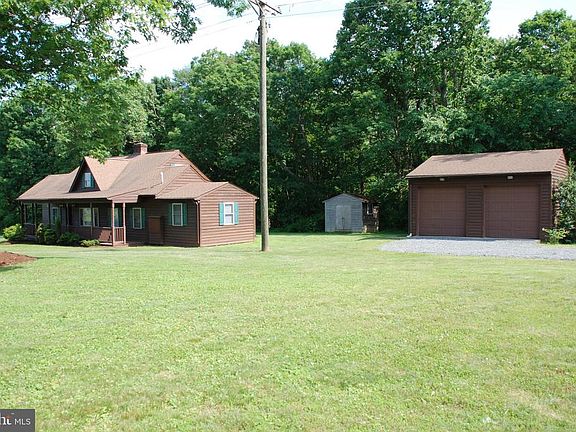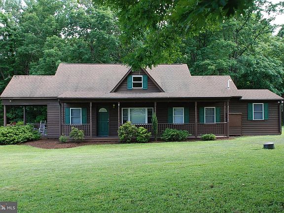 Rambler with 1.5 levels and an unfinished basement located on 2 country acres. Covered front and side porch, detached 2-car garage, paved road frontage. Interior includes a main level master bedroom with master bath, brick fireplace, laminate flooring, wood floors on upper level, kitchen with stove, refrigerator, and dishwasher. Home has had remodeling done over the years. Gas propane heat and central air conditioning. Located just a few miles from the Kellys Ford Inn offering dining, overnight guests, bar with entertainment, large arena for shows, guest cottages that can be rented, horses available for country side rides.