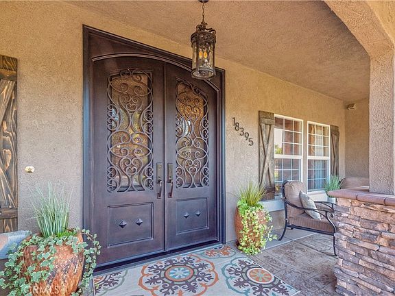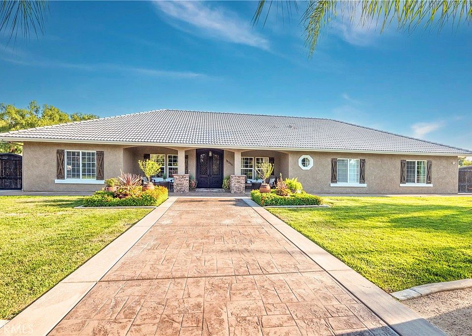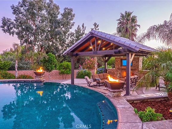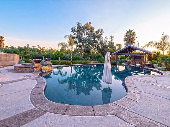 Welcome to this extraordinary Woodcrest mini compound, a sanctuary of sophistication and privacy. Just beyond the electric wrought iron gate you'll be greeted by the elegance of custom wood gates, El Dorado veneer columns and the soft illumination of sensor-controlled exterior lighting. The Asher Slate stamped and colored concrete in the front and backyards exude timeless charm, complemented by a commercial-grade driveway that adds a touch of grandeur. Step through the stunning double iron front door to discover modern wood-look tile plank flooring flowing seamlessly through most every room of this exquisite residence. A chef's kitchen boasting high-end stainless steel appliances, including a professional 6-burner range with a double oven, Patagonia granite countertops, cabinets with 7" Venetian bronze hardware and soft-close mechanisms. A Waterstone Gantry faucet graces the Native Trails farmhouse concrete sink, surrounded by Nabi Harlequin metallic copper glass tile and bathed in the warm glow of Uttermost and Mika lighting. Custom Knotty Alder cabinets in the kitchen and bonus room, complete with interior and under-mount lighting, provide both elegance and functionality. Crown molding graces most of the home and custom draperies frame windows with style. One of many unique features is a 100-year-old Douglas Fir mantel that adorns the gas fireplace in the family room. The ample primary bedroom offers a walk-in closet with a built-in system. The exquisite ensuite features a Native Trails 66" free-standing concrete tub and sinks, brushed champagne faucets and shower head, a shower and tub clad in Calacatta marble along with Uttermost mirrors and lighting that add an extra layer of sophistication, while a vanity with soft-close drawers and pull-out storage ensures practicality. Step outside to your own private resort, complete with an oversized negative-edge pebble pool & teardrop 8-ft spa with remote-controlled lights & ozone system, four gas fire bowls, Cantilever coping and glass tile. Real stone veneer graces the pool area, outdoor fireplace, the BBQ, and stair planters. The features continue with a fabulous outdoor kitchen & patio covers with integrated lighting. The lush lawn and low-maintenance hardscape grounds featuring river rock and DG create a captivating ambiance. Amongst the amenities are a bonus room, a 552 sqft enclosed patio, an oversized garage finished with race deck flooring, paid solar system and a large lot with ADU potential!