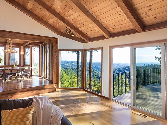 Located in the coveted Las Cumbres community, this incredible home boasts breathtaking panoramic views extending to the Monterey Bay. Beaches highlight the shoreline by day, twinkling lights after dusk. The formal entry opens to an inviting, bright open floor plan graced by floor to ceiling windows, vaulted ceilings and gleaming hardwood floors. The tastefully remodeled kitchen is open to the dining with antler chandelier, step down living room with wood stove. The master suite with remodeled bath, 2nd bed & hall bath w/laundry complete the main level. Below, 2 further beds, full bath & family rm with wet bar offer potential in-law quarters with sep. entrance/laundry rm. The expansive 2 level decking, newly paved driveway and play area in front provide an abundance of space for entertaining/recreation. The community offers a pool, clubhouse, sports courts, ~1000ac of trails and many social events! Serenity awaits only 20mins from downtown Los Gatos. Excellent Lakeside/Los Gatos schls!