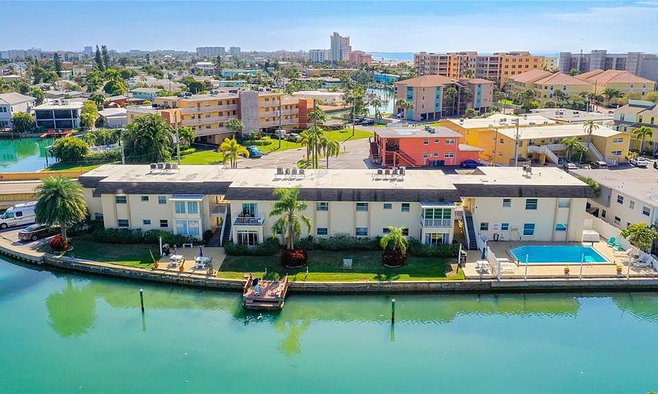 Welcome to Pointe Capri Condos on the Beautiful Isle of Capri! If looking for a Waterfront complex that is just a few blocks from the pristine, sugar sands of the Gulf of Mexico, THIS is it! A small 14 unit complex with glimmering pool located on a saltwater canal-sit and relax watching the numerous species of birds that come by daily, or say hi to the dolphins and manatees that may swim by. Very calm channel to paddleboard/kayak. This ground floor, SE corner unit is tastefully decorated with "beachy" decor (Can come turnkey or partially furnished)and beautiful, cozy sunroom to relax in. This condo is just waiting for a new owner that wants to have a FL. vacation home, Air B & B property or just live the beach life permanently! The choice is yours as there are NO restrictions on Rentals!!!! Many upgrades have been completed: New AC 2021, Hot water heater 2019, Impact windows 2021, stained concrete floors, Updated kitchen 2021, and new bath vanity 2018. This is a quaint, one of a kind property and an investor's dream. So close to Famous John's Pass, Restaurants, Bars, Shopping, and Gulf of Mexico, all walking distance. There is a community laundry (free), bicycle and kayak storage BBQ grills, fishing dock, and immaculate grounds surrounding the water. Hurry! This is a fantastic opportunity!