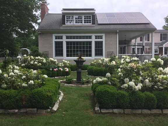 Remodeled and expanded country cape (originally 1235 sq ft) with 1122' finished walk out lower level, new roofing and newly installed solar panels that provide over 75% of electrical usage. Incredible stone wall with mature plantings fronts the estate-like grounds overlooking 1 acre pond.