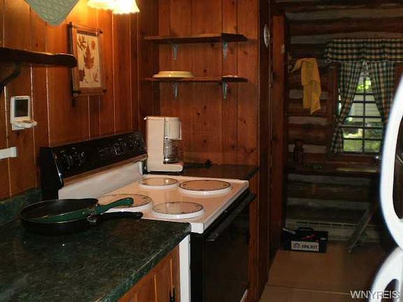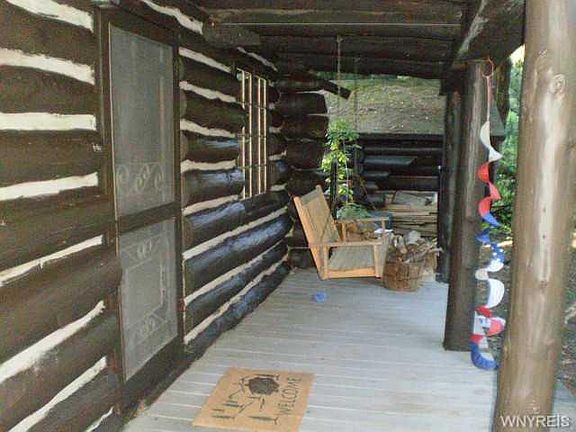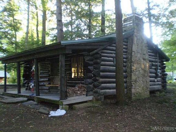 Nicely maintained log cabin located in a wooded setting on the "beach side" of Java Lake and just a short walk to the beach for swimming, fishing and boating fun! The cabin sleeps 6 easily and features an open floor plan with a large Great Room, separate galley kitchen and bedroom and comes furnished with appliances and furniture. Beautiful stone fireplace plus a vented kerosene wall unit for those cool evenings, plus a large storage building, updated steel roof and water conditioning system