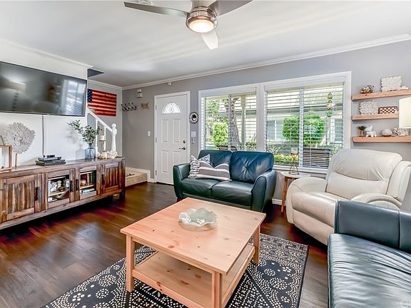 Welcome home to your beautifully remodeled 2-story home in the highly sought-after Monticello community. The beautiful porch welcomes you to this move-in ready 3 bedroom / 2 bath home featuring an upgraded kitchen with beautiful quartz countertops, white shaker cabinets, glass tiled backsplash, new vinyl flooring, and stainless-steel appliances. Making this the most popular floorplan in the community is a main-level bedroom with laminate flooring, crown molding, and an adjoining 3/4 bathroom. The bathroom features a walk-in shower, updated vanity, and light bar. The oversized living room boasts dark laminate flooring, scraped ceilings, crown molding, ceiling fan, and plantation shutters. The upstairs features two spacious bedrooms. The master with mirrored closets, ceiling fan, and carpet. The other with dual closets, laminate flooring, and ample natural light. Enjoy your private patio ready for entertaining conveniently located between your home and your two-car garage. This home has it all with scraped ceilings, crown molding, ceiling fans, and custom paint. The community, which is being completely repainted, features two pools, spa, clubhouse and a low HOA that includes water and trash. Don't miss this "Pride of Ownership" neighborhood close to shopping, restaurants, Orange Coast College, Vanguard University, Newport Back Bay, Orange County Fairgrounds, freeways, and only a 10-minute drive to the beach.