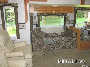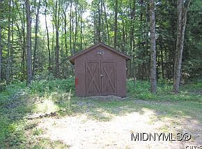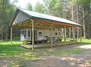 Beautiful wooded lot with clearing. Large travel trailer sheltered under open pole barn connected to an approved septic. Water from a dug well, new wood deck. This is the perfect seasonal camp. Hunt, snowmobile, or build a year round home.
