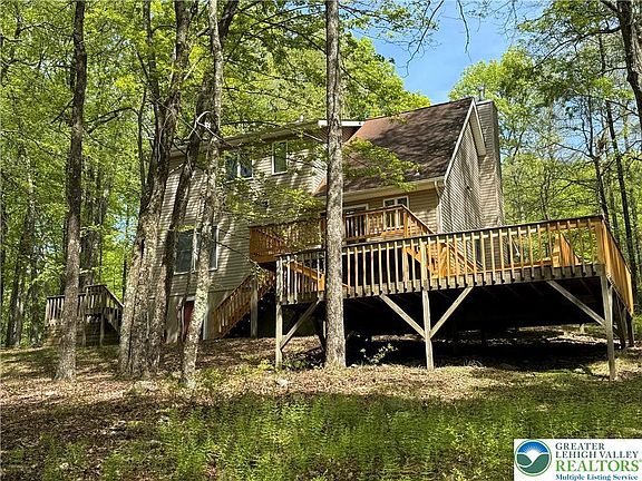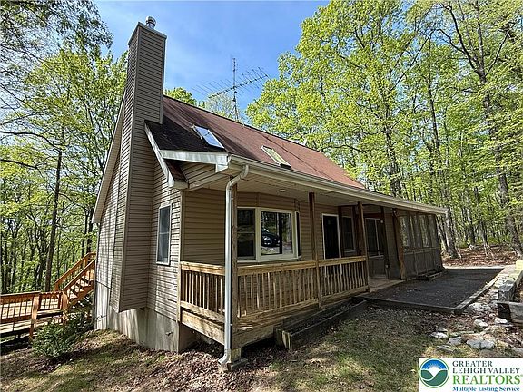 Pocono Ranch Lands, A gated community, Beautiful Cape Cod that backs up to Lake Maskenozha, This beautiful single has a 3 tiered deck to enjoy nature and the views of the lake, screened porch, towering cathedral ceilings with skylights open to kitchen with all new stainless-steel appliances, breakfast bar and walk in pantry, 2 more 1st floor bedroom share a full bath, Upstairs in the primary suite with a large walk in closet, en-suite bath including a jetted Jacuzzi tub, glass shower, Full basement, This splendor in the woods in your Pocono paradise found! Situated in Gated Poconos Community of Pocono Ranch Lands Amenities Include 2 Outdoor Heated Pools, Clubhouse, Members Only Horseback Riding, Tennis Court, Basketball Court, Playgrounds, Horseshoe Pits & More!