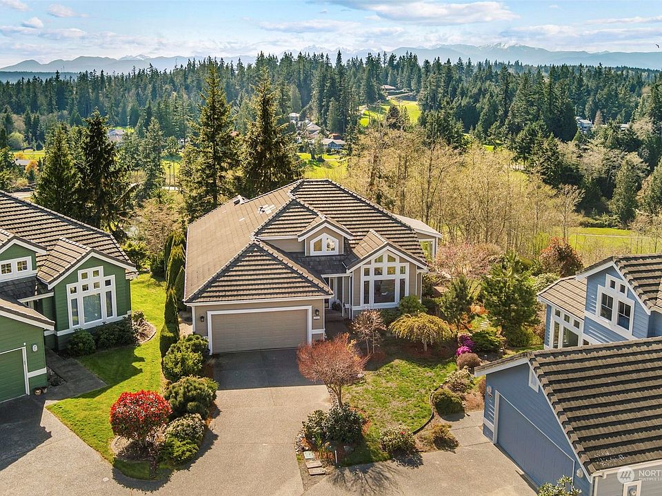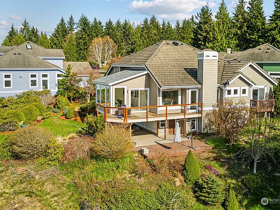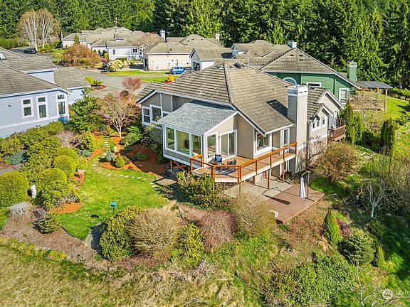 RARE sweeping bay, territorial, and Olympic Mountain views are yours from this beautiful one-level home perched high on a hilltop! Lovingly maintained home enjoys spacious living/dining room with built-in fireplace, soaring ceilings, & wall of windows bringing the outside in. A second gathering space w/propane fireplace opens into roomy, updated kitchen & breakfast nook. Gaze at the view from every window in brand-new sunroom, with its own cozy fireplace! Large primary suite w/walk-in closet, updated 5-piece bath, and slider onto its own deck. A 2nd bedroom, den/office & additional 1-1/2 baths, too! Star-gaze and relax on the gorgeous new Trex deck, and enjoy the park-like beauty of the property surrounding you. A very special offering!