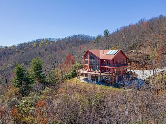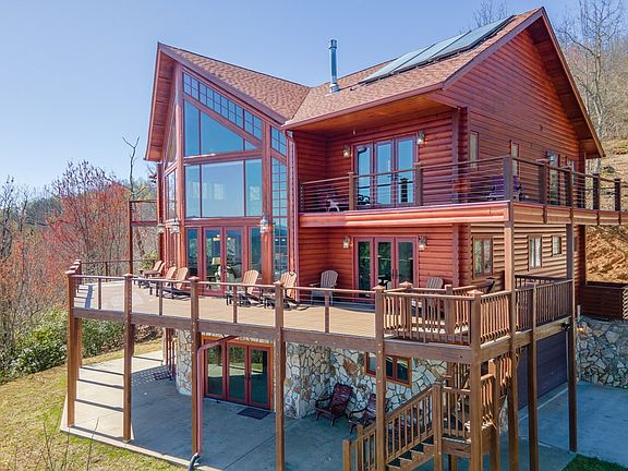 Phenomenal Custom Log Home 4 Bedroom 4 Bath w/2car garage. MAGNIFICENT mountain vista views for miles (the best in Macon Co.) Sitting on 3.24 Acres, & adjoining USFS on west side makes this property very private. Cooler temps sitting at approx. 4000 ft. elevation w/southern exposure. Main level has an open floor plan with wall of windows for the views. Kitchen w/high end appliances, gas range, dbl. ovens, dw, breakfast bar island, dining rm, soaring high ceilings, rock gas log fireplace, hardwood floors & tile throughout main. Primary on-suite, huge shower w/body jets, whirlpool tub, bidet, walk in closet & private balcony. Upper-level loft open to great rm, 2 bedrooms, w/private balconies & full bath. Lower level has a family/game room, pool table, darts, and potential theater as it is pre-wired for surround sound & ceiling mount projector. Bedroom, full bath, patio. Intercom throughout, New Trex decking on every deck. Freshly stained this year, whole house generator, Energy EFF. home. Solar panels for heated floors on main level & hot water heater. Private well, buried & owned gas tank. Concrete driveway, Gated community! 7 scenic miles to town. Amazing Home & comes FURNISHED