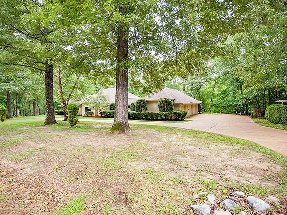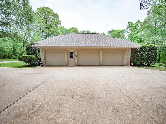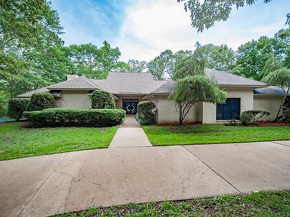 THIS ICONIC HOME Is Located On A Private 5+ Acre Lot. Included in the 5 acres is a stocked acre +/- pond with a dock. Go fishing in your own back yard. Beyond the pond the lot slopes up making the rear completely private and it's also heavily treed. There are so many amenities for the home. Need room for a very formal dining room? This home has a dining room that can fit a buffet, china cabinet(s) and a table with all the leaves installed. All rooms are cavernous, each having it's own architectural detail. Room size measurements are approximate. Many rooms have volume ceilings - the great room is up to 22 feet at the peak of the cathedral ceiling. The master bathroom has two water closets, a soaking tub, a steam shower, dual split vanities and dual walk-in closets. Ceilings up to 12 feet can be found in the master bedroom along with a gas log fireplace. The study/office is on the same side of the home as the master bedroom. Instead of closets, the study/office has built in bookshelves on the side of the gas fireplace. The other two bedrooms have their own separate wing/area. They are separated by a Jack and Jill bathroom. In the kitchen area you have massive amounts of cabinets and other places for storage, including a pantry that is home to the water treatment system. Ceiling height is approximately 12 feet at the top. Heat, water heaters, 2 of the 3 fireplaces, and the cook top are fired by efficient LP gas. The 3-car garage is attached by a breeze way, and separated by a court yard. Inside the 3-car garage is an alcove for storage of tools and shop-type equipment and room for a large work bench. Also, the garage has another area of storage that is lockable. Security covers all garage doors and windows and the house, of course. There are many places outside the garage to park a boat maybe or additional cars. Check out all the patios and covered porches.
