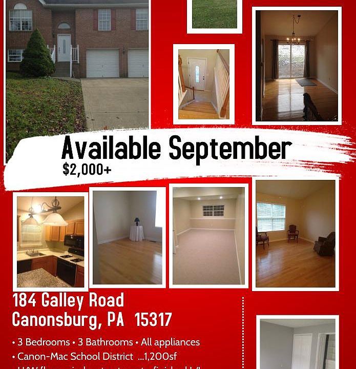 This 1206 square foot single family home has 3 bedrooms and 3.0 bathrooms. This home is located at 184 Galley Rd, Canonsburg, PA 15317.
