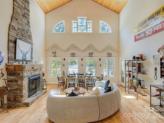 Water views from nearly every room in this four-bedroom, three bath lakefront home. 231 feet of frontage on Lake Hickory with covered boat dock. Soaring, vaulted, beamed ceiling in great room with floor to ceiling stone fireplace. Main level kitchen has Thermador appliances, including 36" six burner commercial range. The large lower-level rec room has a full kitchen (or wet bar). Over 1500 sf of covered outdoor living area. Easy walk to the dock. Level driveway. Located in beautiful, gated, golf cart friendly Anchors Landing! Community amenities include community clubhouse, swimming pool, pickleball court, basketball court, stocked fishing ponds and miles of walking trails. Community events like ice cream social, first Fridays social (first Friday of every month at the clubhouse) and other holiday-based events make Anchors Landing a gem and a joy.