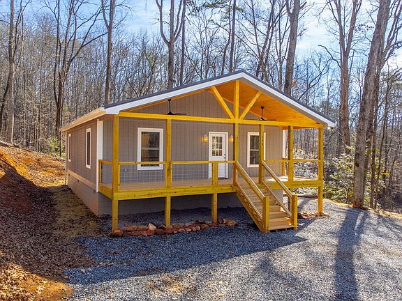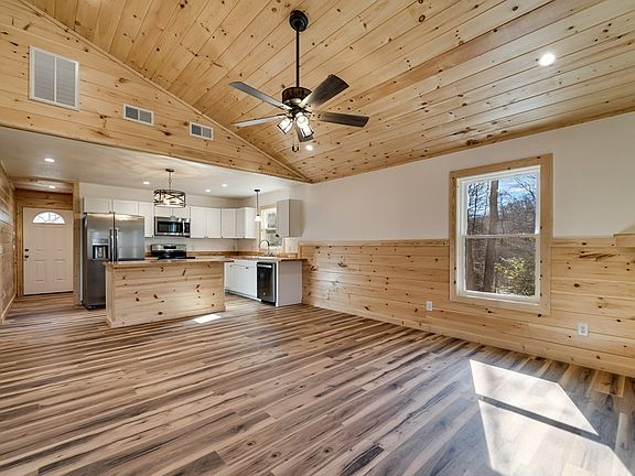 Move-in ready and brand new! This stunning 2-bedroom, 2-bath cabin is perfectly situated between Bryson City and Cherokee in a peaceful neighborhood with end of road privacy! Enjoy the ease of main-level living with an open-concept design featuring a vaulted tongue-and-groove ceiling in the spacious living area. The adjacent kitchen shines with butcher block countertops, stainless steel appliances, ample cabinetry, and an island with a 3-person breakfast bar. The primary suite offers a vaulted ceiling, a large closet, and an ensuite bath with a dual vanity. A charming guest bedroom, accented by wood walls and ceilings, sits next to the second full bath. The XL laundry room provides abundant storage or potential pantry space. Relax on the covered front porch and listen to the soothing sounds of the Oconaluftee River. Love fishing or paddling? A large fishing pier and canoe launch are just a short walk away. With a metal roof, central heat and air, a flat, low-maintenance yard, and easy access to a state-maintained road, this home is perfect for year-round living or a vacation rental. One of the nicest homes in the dam neighborhood—don't miss it!