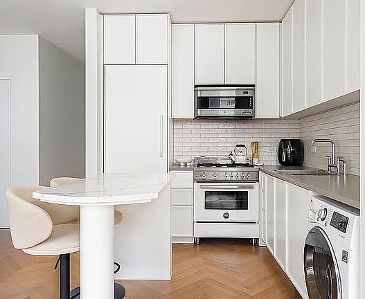 The open kitchen features a custom kitchen island, Caesarstone concrete countertops, a Japanese Kyoto tile backsplash, and top-of-the-line stainless steel appliances, including a gas oven, stove, dishwasher, and in-unit washer/dryer. Stunning herringbone hardwood floors run throughout the residence, enhancing the loft’s timeless sophistication.