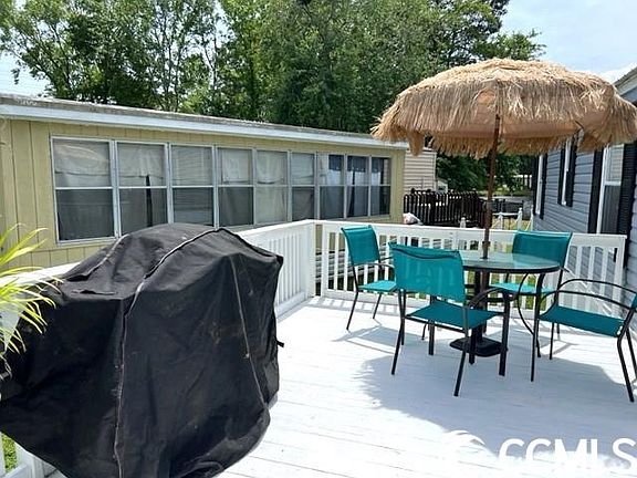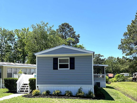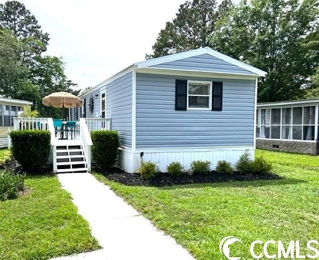 FURNISHED 2 Bedroom/1 Full Bath just a golf cart ride away from the beach!!! Newer Siding and Skirting. New metal roof 2021. The inside has been recently repainted and has new carpeting in 2022. HVAC was new in Nov. 2012.Property includes a large storage shed at the back of the property as well as a screened-in porch with a view of the lake and fountain. Front porch for grilling and entertaining. Custom tile shower. Enjoy relaxing by the community pool on hot days. Whether you are looking for a 2nd home, beach retreat or permanent residence, don't let this one get away. Close to everything including the famous MarshWalk, excellent restaurants, medical and don't forget about the BEACH...only a few minutes away by golf cart!!! Come home to your own perfect beach bungalow! No HOA. See info regarding monthly land lease. Buyer responsible for verification of all dimensions and sq. footage as well as all matters associated with Windjammer Village mobile home park.
