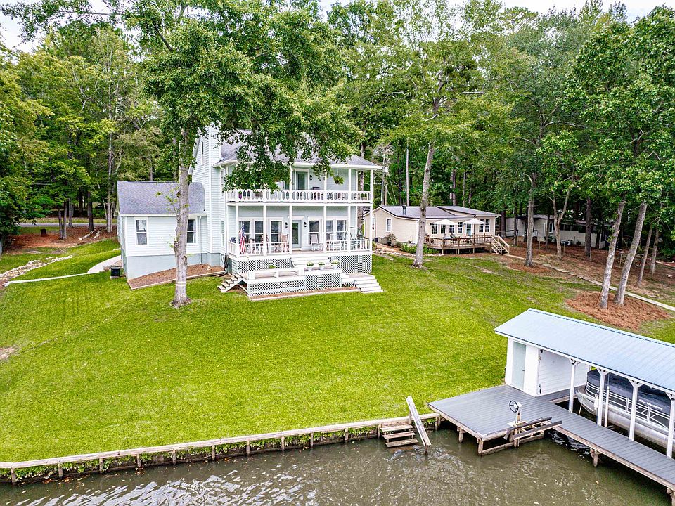 Charming and Spacious Cottage lake home with double 32ft wide lakeside porches, 10ft deep water, great view of water from most rooms. If you love entertaining at the lake – you’ll appreciate the updated kitchen, big gathering rooms, and multi-level lakeside deck. Large flex/hobby room off kitchen with great storage and seperate room for freezer and knik knacks! Private upper porch is accessed from the large master suite. Two well appointed bedrooms and a complete bath finish out second level. Loft area has its own full bath Extras include a basement under the family room for great storage you can easily walk in and out of. Detached garage – you will not find a better value on the lake! You’ll love the convenient location – just 10-15 minutes to the areas amenities. Verbal approval from Ga Power for dbl boathouse.