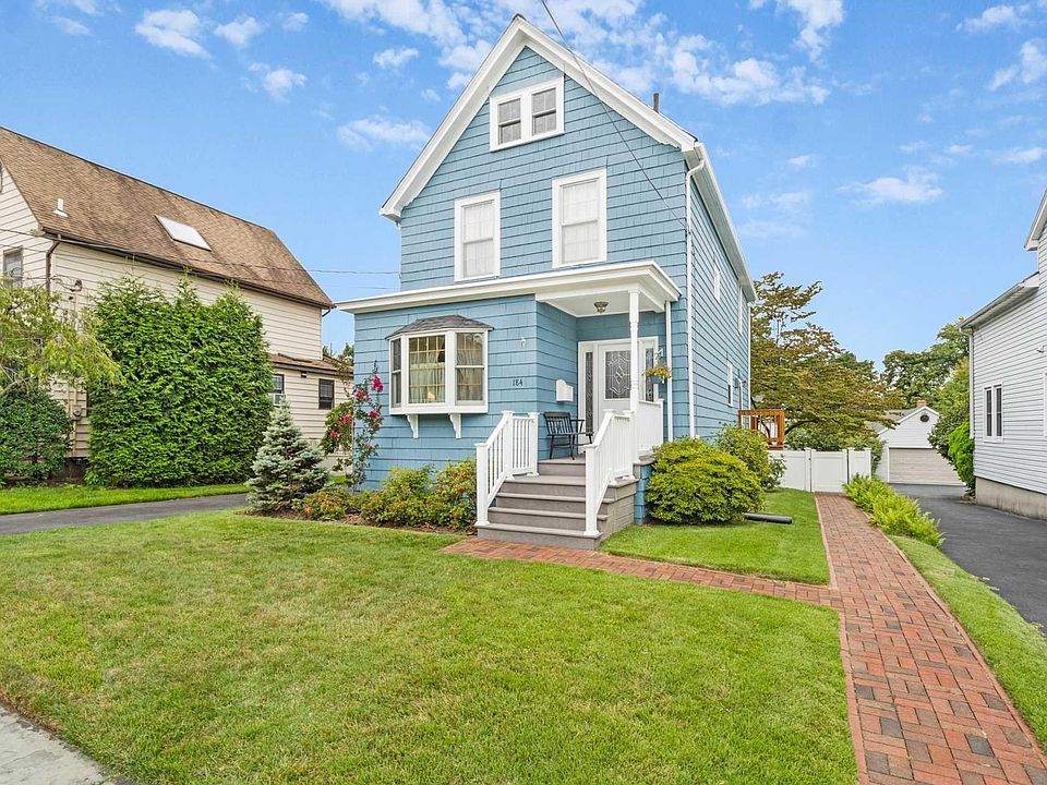 Welcome to this inviting 3-bed, 1.5-bath side-hall colonial! The first floor showcases a spacious living room, dining room, eat-in kitchen with granite counters, den with sliders to a large rear deck, half bath, laundry, chestnut trim, and beautiful hardwood flooring. Pella windows and an Anderson bay window fill the space with natural light. Upstairs, you'll find three generous bedrooms with ample closets and a full bath. The walk-up attic provides the perfect canvas for your personal touch. Additional interior and exterior features include, gas heating system, central air, 4 ceiling fans and the exterior cedar shake siding and trim has been recently painted. The fenced-in yard boasts a gazebo and shed for outdoor enjoyment. Conveniently located near NYC Transit, restaurants, schools, and parks. Don't miss out on this fantastic opportunity! Please note: Sale contingent upon seller finding suitable housing. Sold "as-is", no credits or repairs by seller. Home Warranty Included!