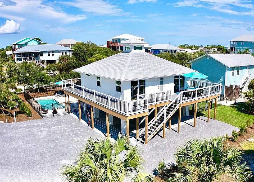 This is a unique two bedroom, three bath home with a deck, private inground pool surrounded by a lush landscape and fenced yard. Covered area with seating and grill area just off of the pool deck with full bathroom for added convenience. Open and airy are the best words to describe this cozy home. High end appliances and gold hardware accent the beautiful finishes. It's small, but classy and luxurious. Complete renovation in 2024! Cape San Blas is a place where families come to relax, friends unite, and memories are made. This fifteen mile west-facing peninsula in the panhandle of Florida offers amazing white sand beaches, emerald gulf waters and the highest dunes on the gulf coast. The TH Stone Memorial State Park and all its untouched tropical nature is just three short miles north (a short bike ride or walk). Oversized parking to accommodate a boat with freshwater hose bibs for rinsing. Bedroom 1: King ensuite, private bath, single vanity, shower, deck access. Bedroom 2: King ensuite, corner shower, single vanity, shower, TV, deck. Ground level: Parking for six+ vehicles and trailers Covered storage/beach chairs. Stairway to main entry. Private inground heated pool with lush lawn, lounge seating and outdoor shower. Full bath with walk-in shower. Locking beach gear closet Weber grill Easy beach access Second Level: Main entry access via steps from ground level. Elevated 360 degree wrap around composite deck w/views of gulf. Livingroom w/fireplace, 75” smart TV and plenty of seating. Kitchen with GE Caf appliances, fully stocked pantry and island seating for four. Two king bedrooms with direct access to decks. Laundry closet. Open Gourmet kitchen with large quartz island, top of the line appliances (48 inch freezer/fridge, two dishwashers, 2 large sinks, 48 inch range), and tons of serving/pantry items. Reverse Osmosis water line for drinking and ice maker. Whole house water softener