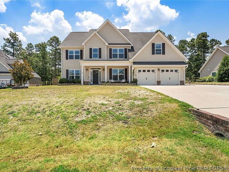 5 bdrm, 4 ba home w/re-modeled kitchen, updated light fixtures, new paint, beautiful new LVP floors on entire 1st floor. Walk into a grand foyer w/1st floor bedroom currently used as a playroom, w/ attached shared full bath. The sitting room and dining room w/coffered ceilings great for entertaining. The re-modeled kitchen w/large island overlooks a large flat yard! The cozy family room is open w/wood burning fireplace. 2 staircases lead upstairs to 4 bdrms, w/raised ceilings & Jack n Jill Bath. 1 room has a closet large enough to be used as playroom. Primary bdrm is a dream w/lake view, spa like bath w/soaking tub, and XL closet. Outside is a large patio, shed, magnolia trees, and firepit. Step away is the lake & a 1 mile dam trail perfect for biking or running. Amenities: Marina w/beach, tennis & basketball court, playgrounds, & pool. What's New: dishwasher, water heater, & water pressure regulator. A 24 min drive to the closest Fort Liberty ACP.