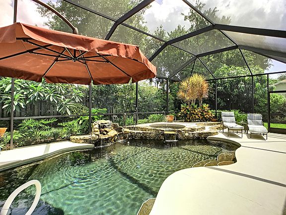 MOVE IN READY! Pride of ownership in this meticulously maintained & beautifully landscaped pool home on a quiet street in deed restricted Sykes Cove! Many custom upgrades built into this 3/2 + office/4th bedroom. TradeWinds-built sturdy block home including hot tub and waterfall, storage space in garage and attic, custom built in entertainment center in living area, pavered driveway, outdoor hot/cold water shower, under cabinet lighting, and extra square footage to make bedrooms & garage larger.Tile floor throughout home with carpet in the bedrooms and dining area. Open floor plan w sliding glass doors leading out to a large covered lanai by the screened pool and hot tub. Security system installed. Enjoy rocket launch views from your own backyard! palms and trees! Yard contains lots of plants (including mangos!) & low voltage lighting. Beautiful window treatments and room darkening shades. Tinted windows on front of home & master bedroom. Front loading washer and dryer.