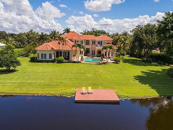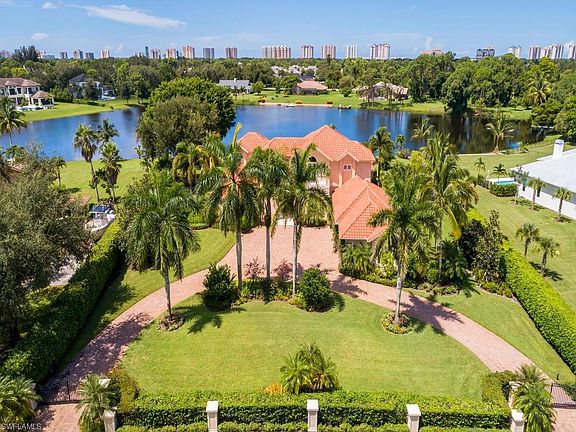 H.14948 - Escape to the country! A serene lakefront haven in the middle of Naples! Enjoy the quiet beauty of this exceptional estate home with wide water, southwestern vistas overlooking Warbler Lake, in the heart of Pine Ridge on over an acre. Gated drive, lush, manicured lawn. Enter through exquisite, arched Mahogany & glass double doors and you will be captivated by the views through the giant picture window overlooking the infinity edge pool and lake. The layout is spacious, open and airy with a natural flow ideal for entertaining. Large, bright dining and living area leads into the perfect, chef's kitchen with a prep island, tons of counter space, breakfast bar and morning room all open to expansive family room. Clean lines, a neutral palette and walls of glass create light-filled rooms boasting lofty, coffered ceilings. Zero-corner sliders provide a seamless transition to lanai w/fireplace, bar, summer kitchen & guest suite/cabana w/bath. First floor boasts a luxurious master suite and an office. Tons of flex space upstairs w/oversized study, 3 bedrooms, 2 baths & spacious loft w/balconies. Private dock beckons you to relax and enjoy Naples' splendid sunsets over the lake.