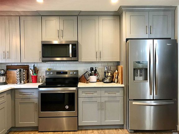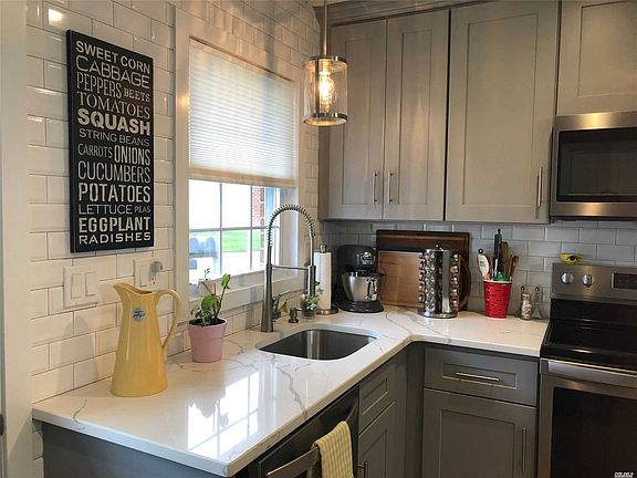 Corner property, thoughtfully designed for ease of living. Absolute turnkey home with custom features throughout. Completely renovated from front to back. Custom kitchen cabinets with ceiling height crown molding, quartz countertops, undermount sink, S.S. Whirlpool appliances with French door counter depth refrigerator. Gleaming white beveled subway tile give a sense of sophistication & shows off the brushed nickel finishes. Your own coffee station,pantry, pendant lighting, high hats, copper sands oak laminate flooring, for easy care, shows that all details were considered. The dining room flows into the living area & has plenty of room for entertaining with a bar area off the the sunroom entry. The master easily fits a king size bed, dresser & wardrobe. The 2nd bedroom can fit a queen size bed but makes a great den or office. The bathroom has new white subway tile, marble-like flooring, new vanity, medicine cabinet & toilet. All new thermostats, baseboards, high hats and chandeliers