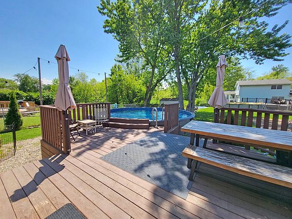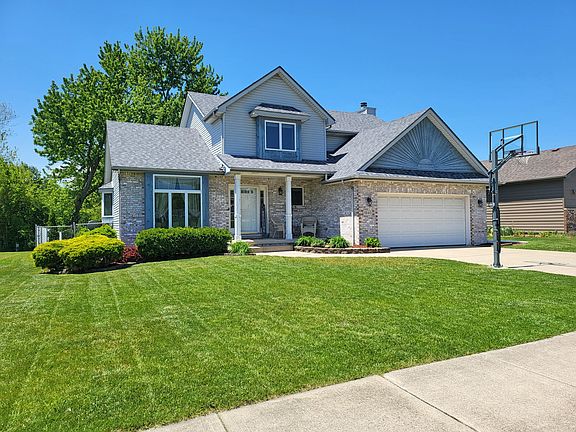 This updated two-story home is located in a quiet neighborhood, yet just minutes away to shopping and entertainment. As you approach the home, you are greeted with a brick and vinyl exterior, along with a covered porch to the front door. Upon entering the home, you will find a flex space with hardwood flooring that can be used as formal dining or an office complimented with a large bay window. Down the hall there is a mudroom, completely remodeled half bath, and an open concept eat-in kitchen with tile backsplash, cabinets with crown molding, recessed lighting, and newer appliances. The dining area of the kitchen offers a slider and large windows displaying the large deck leading to the heated pool, as well as views of the green space behind with plenty of trees. The living room has maintenance free luxury vinyl plank flooring, a gas fireplace with recessed lighting, and a large window letting in plenty of natural light. The room off the kitchen can be used as formal dining or flex space, and comes complete with wainscoting, hardwood flooring, tray ceiling and updated light fixture. The laundry room comes with the washer and dryer and offers plenty of storage and counter space. Upstairs you will find three bedrooms including the large primary, which offers an oversized tray ceiling, walk-in closet and en-suite bathroom complete with a dual sink vanity and tiled shower with jacuzzi tub. The basement is fully finished with a large rec room with recessed lighting, a bathroom offering dual sinks and vanity, walk-in shower, large storage area, and a fourth oversized bedroom with three closets containing built-in shelving, new carpet, and newly installed egress window. Exterior features also include a fire pit area and potential dog run next to deck. Seller is also offering a one year home warranty!