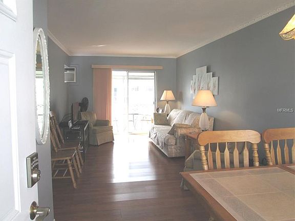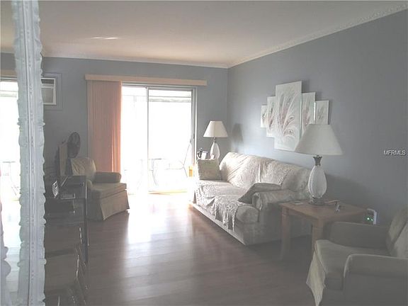 Now is the time to get this great FURNISHED well maintained third floor 1 bedroom 1 bath condo with crown molding, newer laminate flooring in the living room, hall and bedroom. No units above makes for a more peaceful living situation. The elevator is just 4 doors down from the front door and the stairs are right out the front door. Low monthly HOA & taxes make it more appealing than renting. The air conditioning/heating wall unit is just 2 years old, as well as the hot water tank. There's even an extra storage area/closet. The community is a 55+ community and you must be at least 55 years of age to live in this community; no pets (sorry). Check out the great pool area in the courtyard which is just across the parking lot from this unit. There's also a clean, spacious coin laundry & a very active shuffleboard area. Gulf beaches of Bradenton and Anna Maria Island are just minutes away. Plenty of shopping and dining, a fitness center, senior activities in local shopping center, post office nearby, and the best part is, it's all right around the corner.