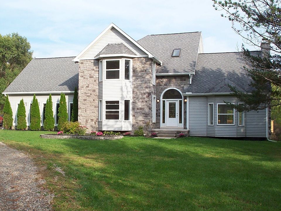 Has an open contemporary floorplan, newgourmet center island kitchen with granite counter tops, maple cabinets, ceramic backsplash and hardwood floor coverings, two story nook with a skylight located by the kitchen, insulated doorwall in nook that leads to a large wolmanized deck, two story foyer, spacious master bedroom suite wirh a vaulted ceiling, walk-in closet and private bathroom, vaulted ceilings in the two other bedrooms, Jacuzzi bathtub in second level hallway bathroom, four bay windows, first floor laundry room, walkout basement, concrete patio located off doorwall, full bathroom partitioned in the basement, and side entrance garage.