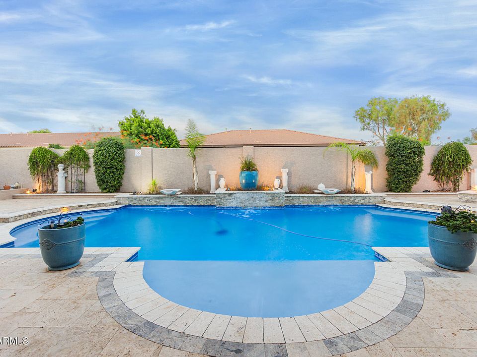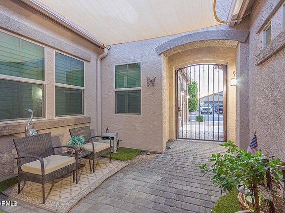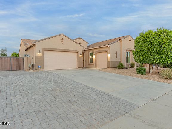 Checking all the boxes with this gorgeous 3 bedroom, 2.5 bathroom home with a flex room that could be a den/office, media center or game room. Open kitchen offering granite tops, double ovens, 36'' gas cooktop, stainless steel appliances, two pantries, large island prep sink & upgraded cabinets. Shutters, surround sound, gorgeous tile & ceiling fans throughout. Amazing corner lot with a resort style backyard. Huge pool, extensive travertine, extended covered patio gas fire pit, built-in BBQ, sunshades, pergola, synthetic grass & citrus trees (lemon, orange, grapefruit, tangerine). Newer Trane HVAC installed in 2023, exterior painted 2022, H20 heater 2021, pool filters 2024 & disposals 2023. Extended length garage w/ 8' doors, gated courtyard, extended paver driveway & 10' RV gate.