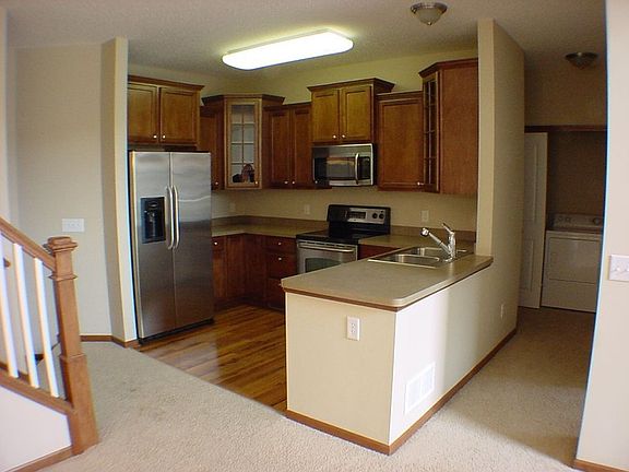 Grandview, 2 BR plus loft, Corner fireplace with east facing windows. The foyer offers plenty of room for a bench, decor, etc. for making it a welcoming and comfortable area. The foyer also offers a surprise -- a walk-in coat closet that doubles as a storm shelter. Two-story living/family room, with gas fireplace and sliding glass door access to the deck. Huge transom window above the sliding doors lets in plenty of natural light. The dining room is an extension of theliving room -- convenient for expanding seating, if you entertain. Beautiful kitchen! Stained maple cabinets include corner cabinets with decorative glass fronts. Stainless steel appliances. A peninsula adds space to thekitchen, while keeping it open to the living areas. The 2nd bedroom is on themain level, with a convenient 3/4 bath nearby. Main floor laundry,with full-sized washer and dryer. At thetop of the stairway is a loft area. perfect for an office, play area, or reading room. Along with the loft, the master bedroom and bathroom are on the upper level. Ceiling fan/light and a walk-in closet in the master bedroom. The bath has a double vanity, and separate shower and soaking tub. Nice deck, over the garage and off the living room. View of natural areas. Fantastic garage is oversized, with plenty of room for "toys" or a workshop. The utility room is off the garage (instead of off the kitchen, as in many townhomes). Another great surprise is a water faucet in thegarage. Very convenient for washing vehicles or tools! Convenient to shopping, bus, freeway, parks. Easy access to I-35. Great Neighborhood! Directions 35W to 185th Street, West 1 Block, Right on Kenyon Avenue, Left on Kingsway Path, Left on Lafayette