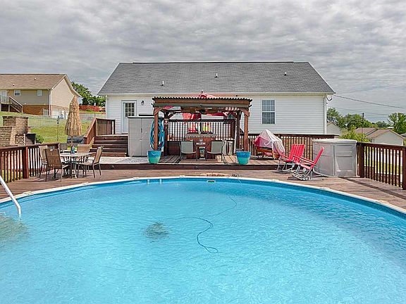 2008 Ranch with partially finished basement; 3BR, 2BA, Above-Ground Pool with large extended deck, covered built-in snack/tiki bar, outdoor fireplace. 30'x40' detached garage heated & cooled, total of 4-Car Capacity (2-Car basement & 2+ Car Detached Garage), Open Floor Plan with vaulted ceiling in Great Room, Dining Room and Kitchen, .55 Acre Corner Lot with Mountain Views, New Laminate Flooring in Great Room and Hallway. Wood Window Blinds Stay. Downstairs has bonus room, office and storage, brick mailbox. Comcast Cable, 2013 Culligan Water Sofener, Septic pumped 2015 and clean-out pipe installed, security system is owned by seller with night vision cameras.