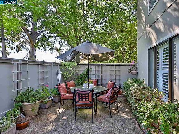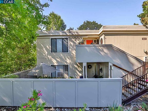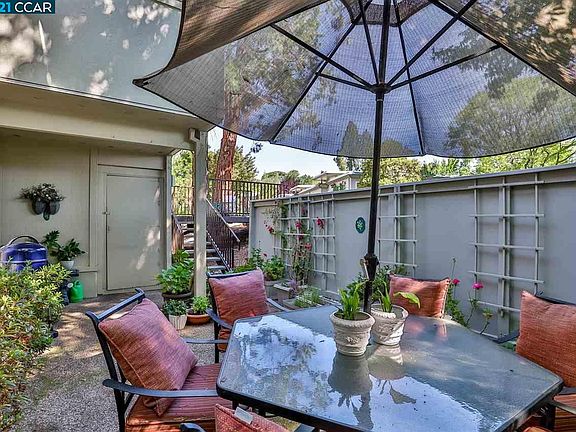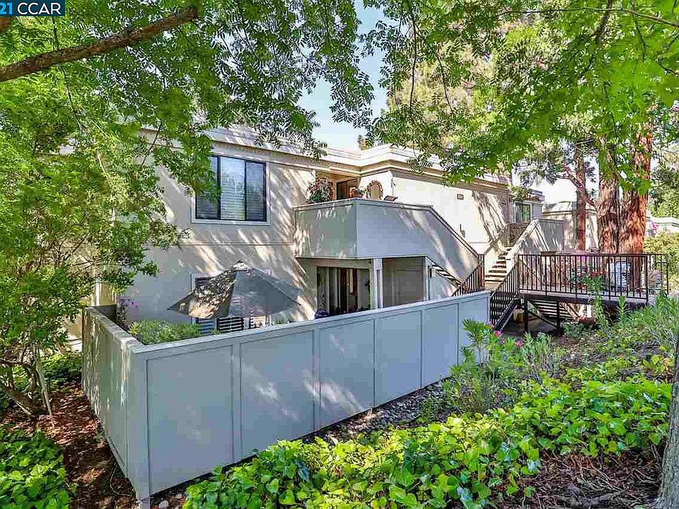 Spectacular wooded setting surrounded by majestic trees and lush green common area. Beautifully updated Carmel with remodeled kitchen and bathrooms, laminate floors, baseboards, and crown molding. Private front patio with view of Mt. Diablo. Enclosed back patio overlooking park-like common area. 4 storage units: 3 in carport and 1 off front patio. A truly beautiful one-of-a-kind setting!