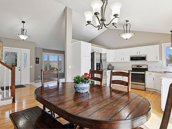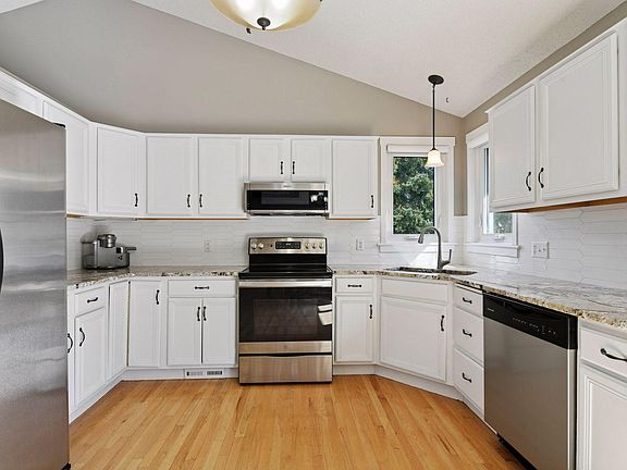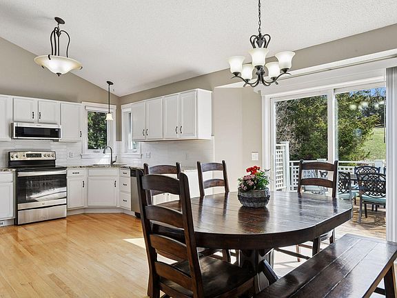 This dreamy modified two-story is nestled on nearly a 0.7-acre lot in the Bluff Creek Estates neighborhood of Chanhassen. Step inside to be greeted by vaulted ceilings and hardwood floors that lead into a sunny kitchen with stainless steel appliances, granite countertops and white enameled cabinetry. The sliding glass door in the dining room walks out to a spectacular, two-tiered deck. This makes for the perfect outdoor retreat to grill and relax with loved ones. The sunken family room features a lovely gas fireplace and a second access to enjoy the expansive deck. This cozy space neighbors a main level bedroom, with current use as a home office. There is convenience of a half bathroom and laundry service nearby. The front living room offers versatile use as a playroom, music room or hobby room. The upper level presents a comfortable layout of three bedrooms and two bathrooms. The primary suite showcases vaulted ceilings with its own ¾ bath and walk-in closet. Retreat to the lower level to find another family room with incredible crawlspace storage and an additional ¾ bathroom. The roof was replaced in 2021, and the A/C and furnace were just replaced in 2024. This fantastic location neighbors Chanhassen High School and offers ultimate convenience to shopping and dining in downtown Chanhassen. YOU’VE FOUND IT!